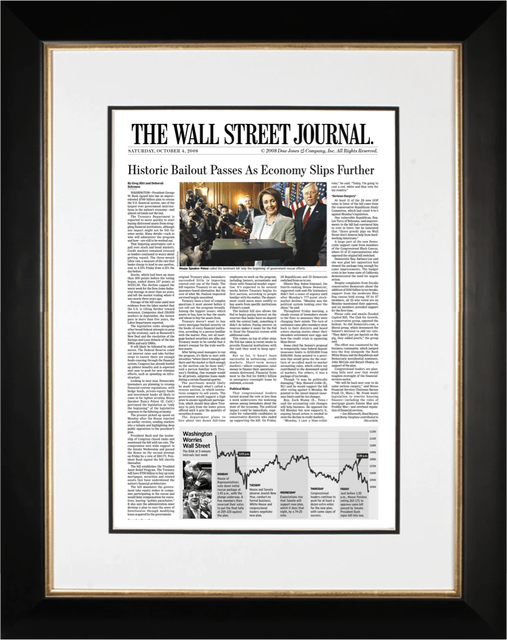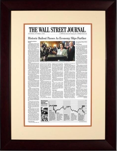 Framed reprint of The Wall Street Journal's coverage of President George W. Bush signing an historic $700 billion plan to rescue the U.S. financial system.