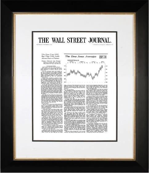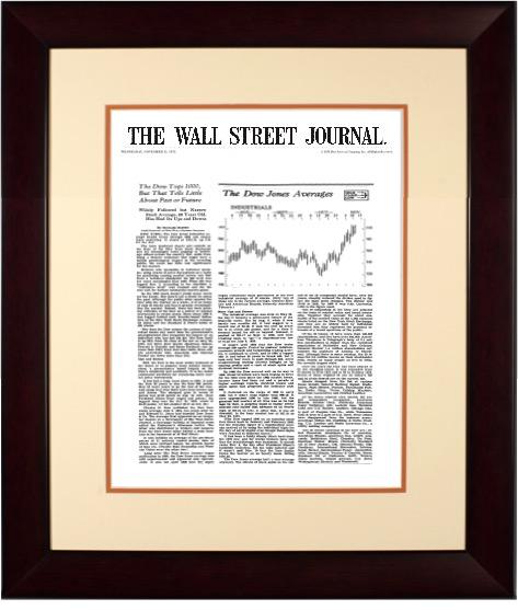 Framed reprint of The Wall Street Journal's coverage of the Dow Jones Industrial Average closing above 1000 for the first time on Nov. 14, 1972.