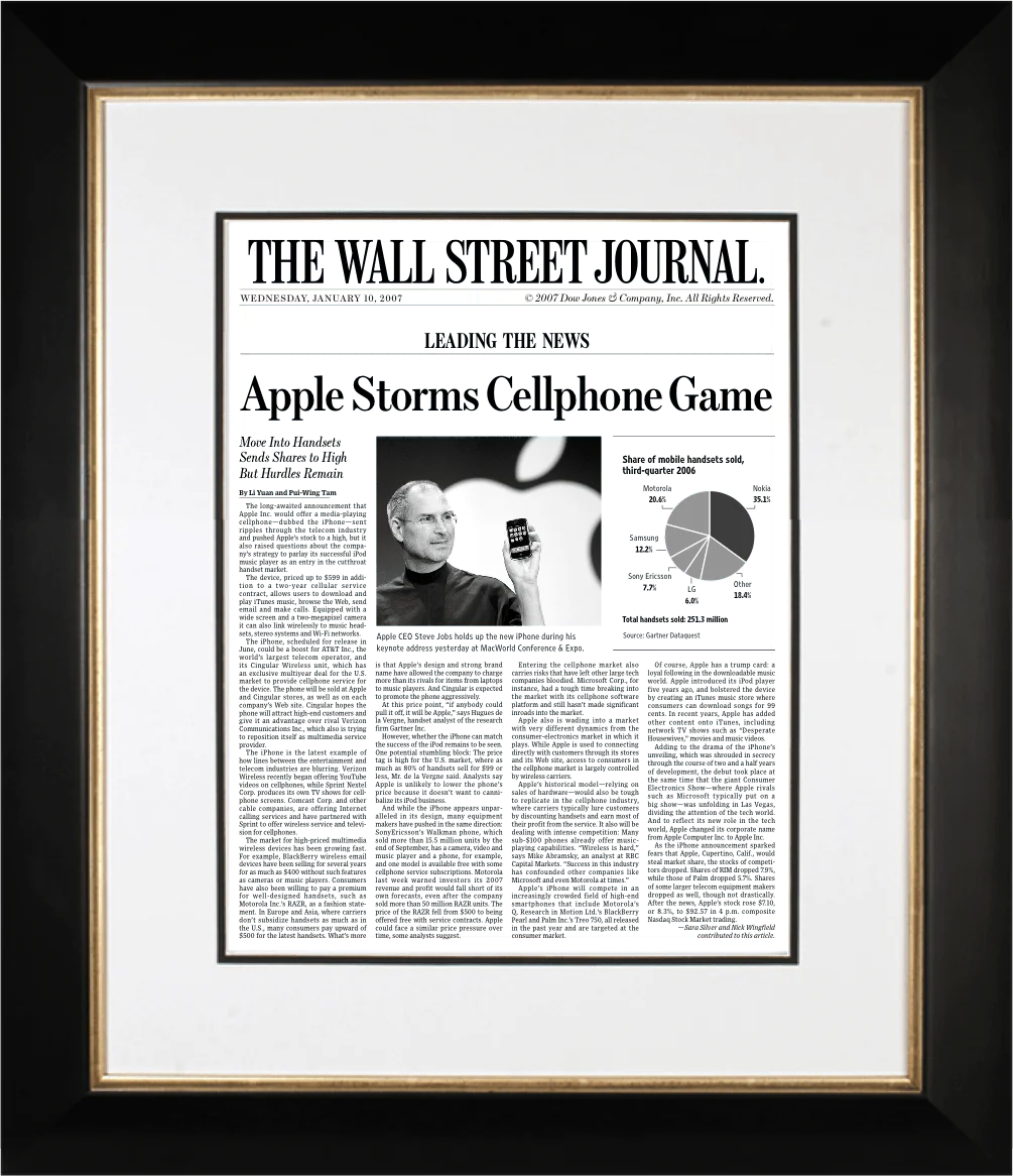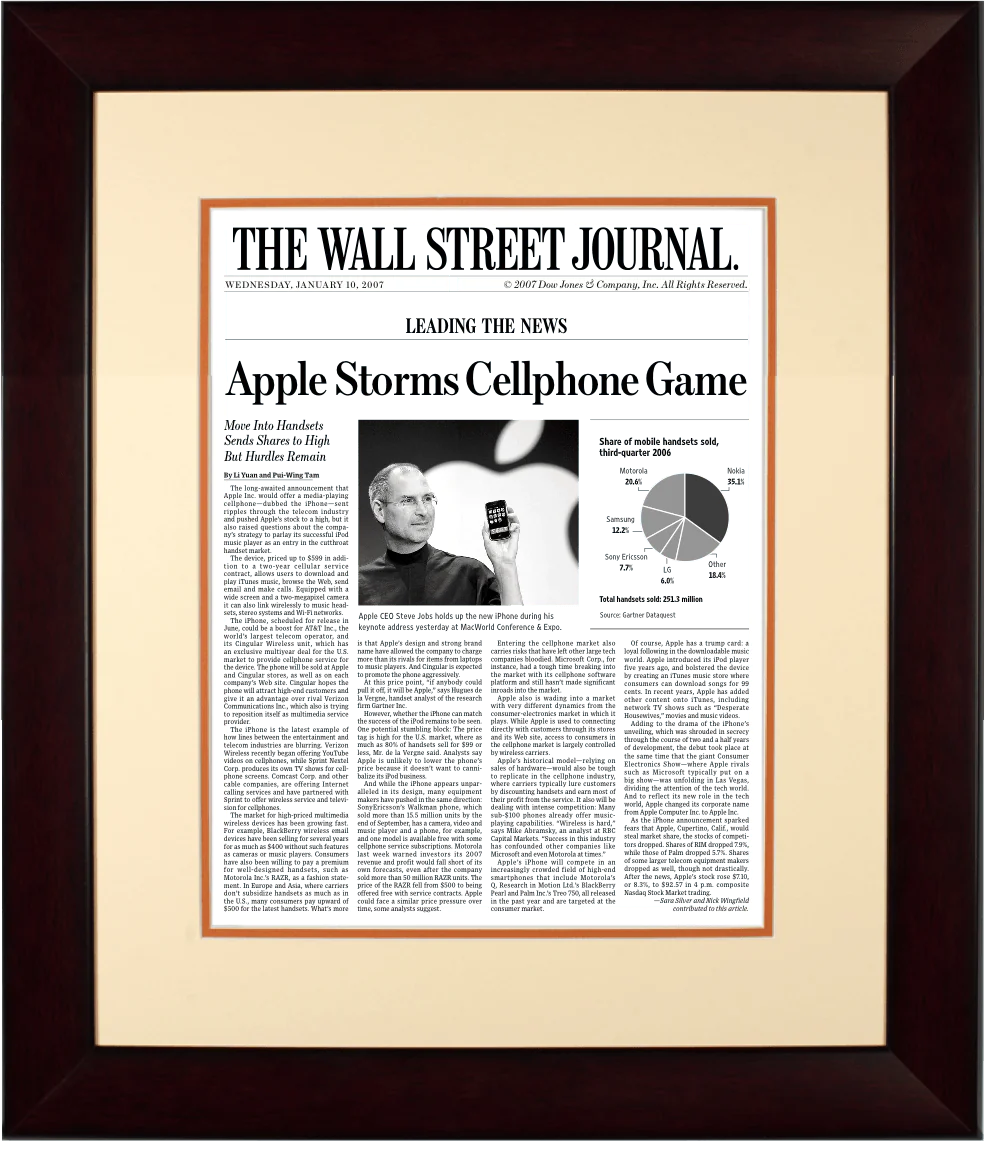 Framed reprint of The Wall Street Journal's coverage of Apple's launch of the first iPhone: