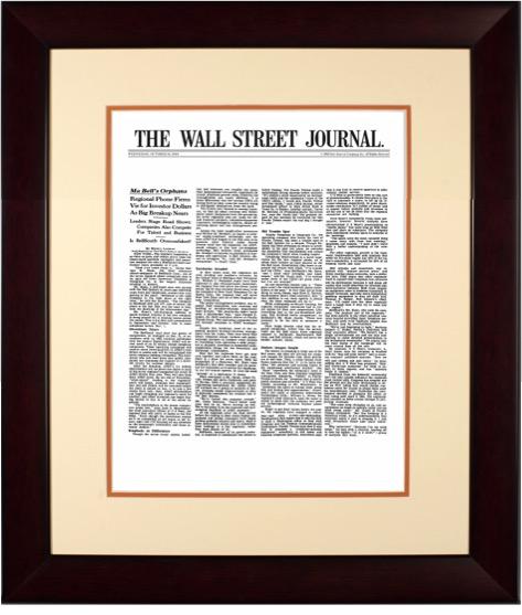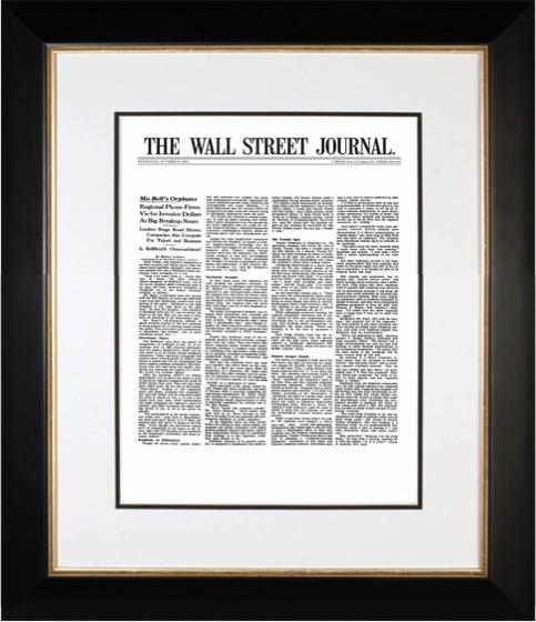 Framed reprint of The Wall Street Journal's leader article in the stressful weeks before AT&T's 22 wholly owned telephone companies were forced to split by an antitrust settlement.