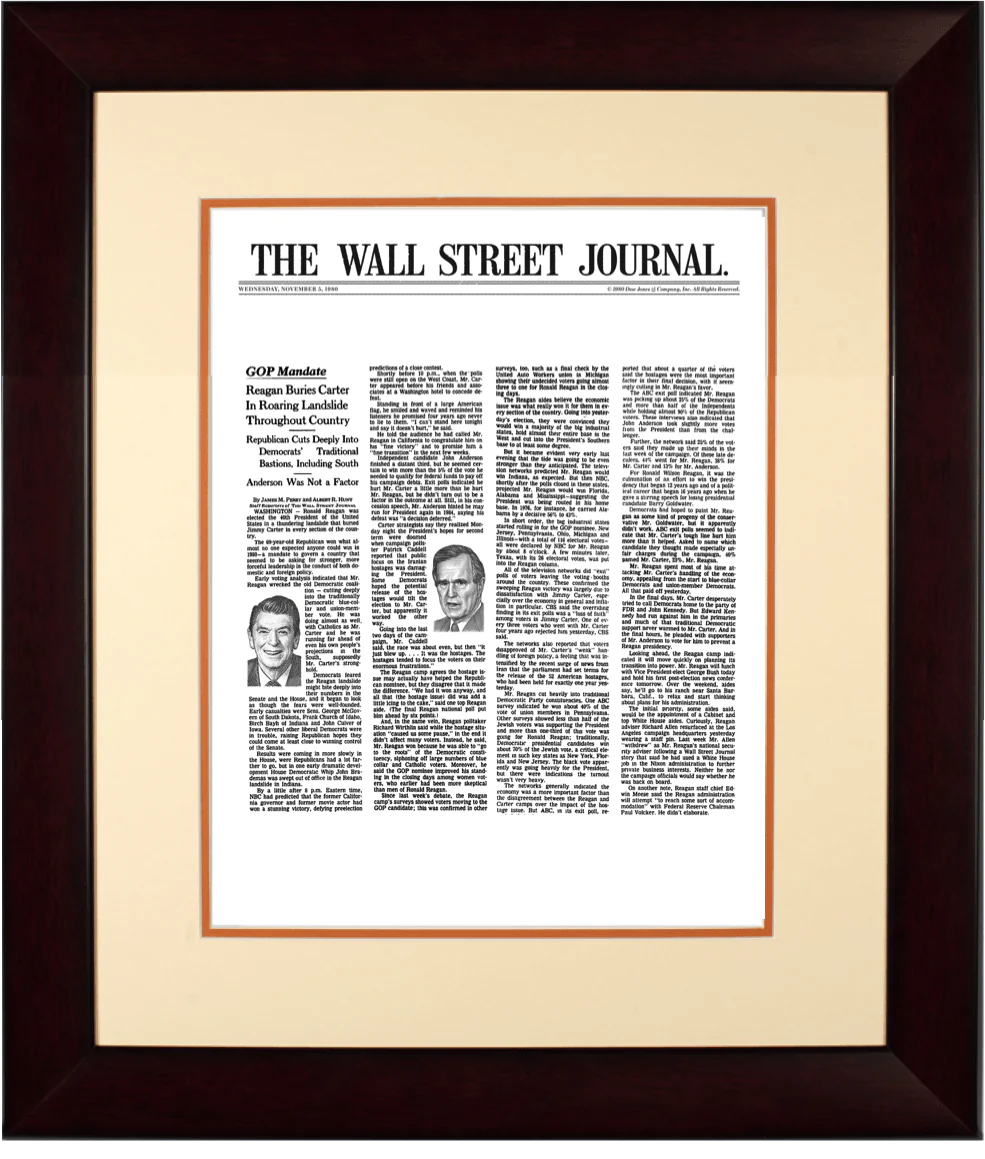 Reagan Defeats Carter | The Wall Street Journal, Framed Article Reprint, Nov. 5, 1980